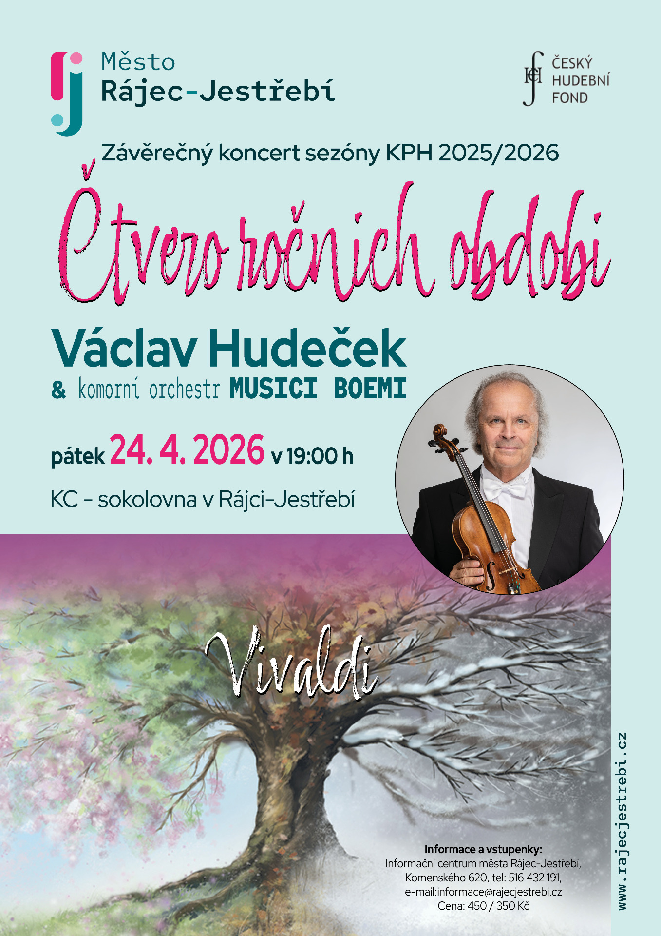 V pátek 24. dubna pak bude podium hostit jedinečný koncert Čtvero ročních období v podání legendy české hudební scény, charismatického houslového virtuosa Václava Hudečka s vynikajícím komorním orchestrem Musici Boemi.