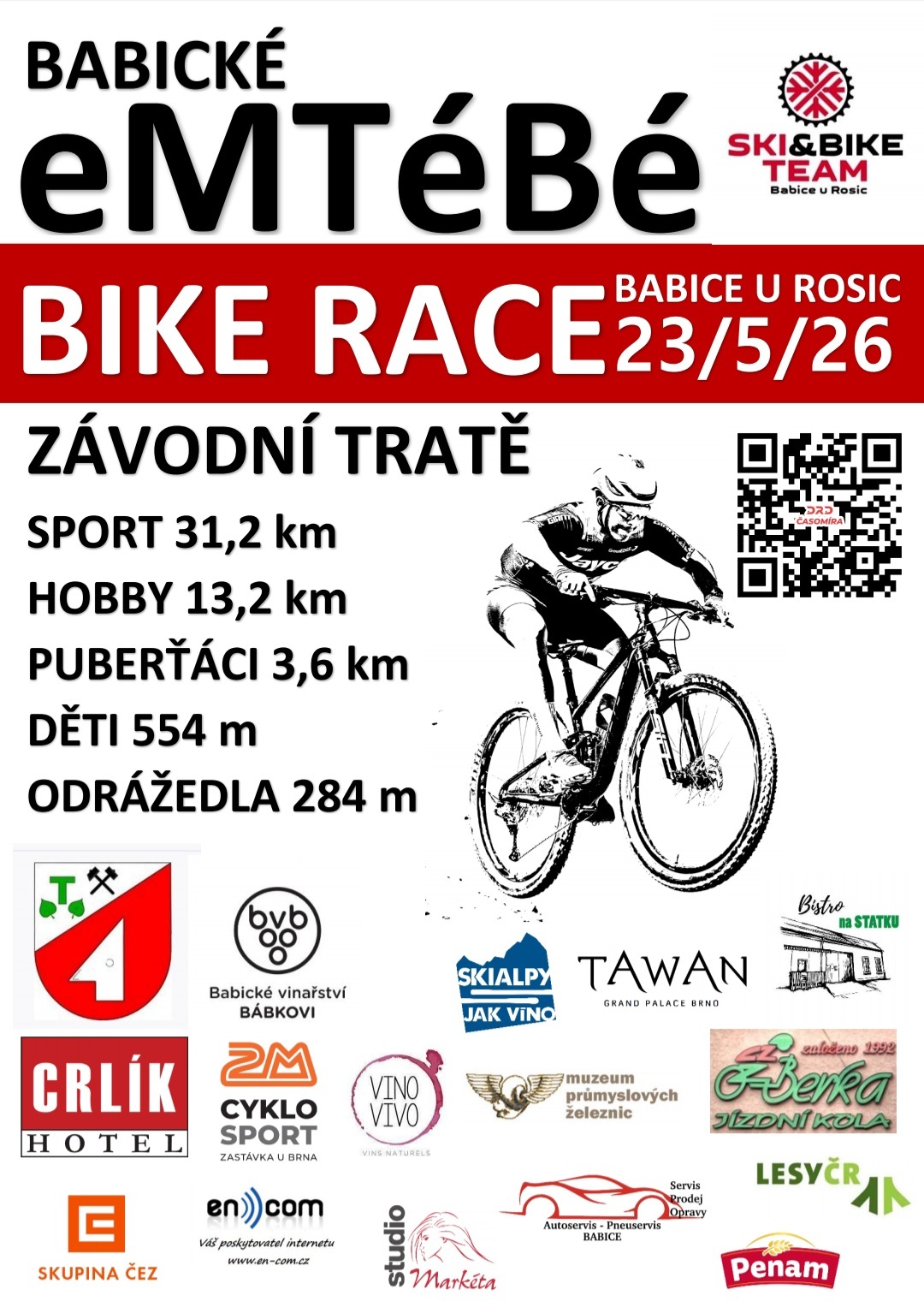 Babické eMTeBé, je čistě amatérský závod horských kol, který pořádá Ski bike team Babice u Rosic za podpory občanského sdružení Babičáci z.s. Závodní tratě jsou vedeny v nádherném lesním terénu v katastru naší obce Babice u Rosic a jsou nastavena pro všechny věkové kategorie.