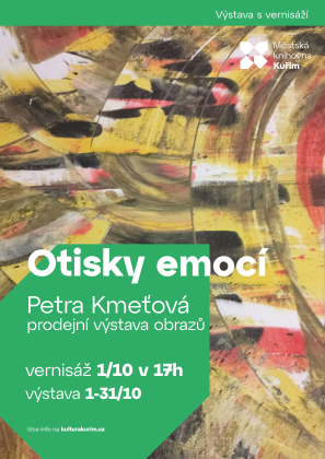 Výstava bude přístupná v otevírací době knihovny. Výstava „Otisky emocí“ představuje abstraktní malby Petry Kmeťové, které vznikají intuitivně a bez předem daného plánu. Autorka pracuje s akrylovými barvami, jejichž prostřednictvím zkoumá hru tvarů, barev a emocí. Její obrazy nejsou popisným záznamem reality, ale vizuálním odrazem prožitků a nálad. Výstava je určena široké veřejnosti a nabízí divákům prostor k vlastní interpretaci a vnímání emocí, které z pláten vyzařují.