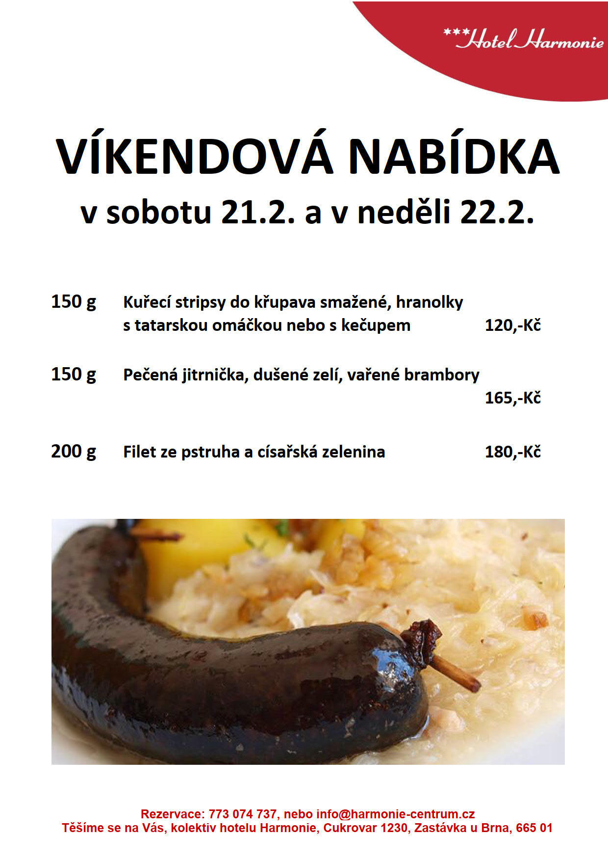 Milí hosté, pro ty, kteří neodcestovali s dětmi na jarní prázdniny, jsme připravili víkendovou nabídku menu, kde jsme mysleli i na děti, co mají nejvíc rádi a také odlehčené jídlo jako je filet bez kosti ze pstruha a císařská zelenina, nebo něco mastnějšího jako je pečená jitrnička :) Koukněte na to a budeme se těšit na vaši návštěvu !