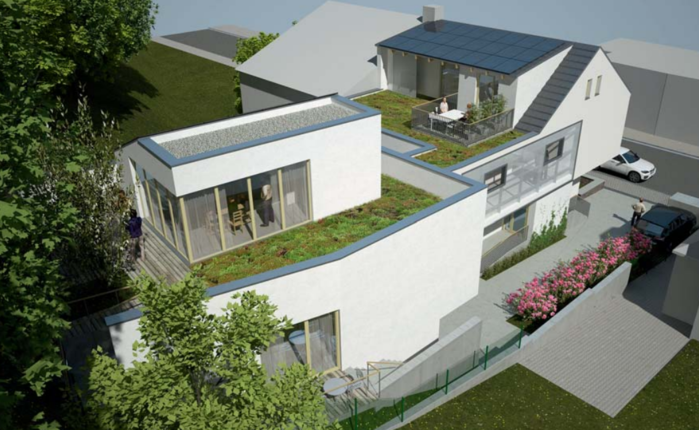 Vlastní urbanistické řešení vychází ze stávajícího stavu. Dnešní rodinný dům bude zachován včetně výšky římsy a sedlová střecha bude zvednuta do úrovně sousedního domu. Stávající přístavky ve dvoře budou odstraněny a místo nich je navržena dvorní přístavba propojená se stávajícím domem nadzemní lávkou. Přístavba je zasazena do prudkého svahu. Ze západní strany je přístupná z úrovně dvora, z východní strany je zcela pod terénem. Podle definice podzemních podlaží dle stavebního zákona se tedy jedná o stavbu se dvěma podzemními a jedním nadzemním podlažím. V prvním nadzemním podlaží dostavby bude střešní pavilon s výhledem na kostel. Nová budova bude projektována s parametry pasivního domu, aby byly minimalizovány provozní náklady na vytápění i chlazení. Budova bude vybavena standardním technickým vybavením. Přípravu teplé užitkové vody předpokládáme centrální, kde zdrojem chladu i tepla bude tepelné čerpadlo systém vzduch voda. Tento systém umožňuje byty vybavit i chlazením.