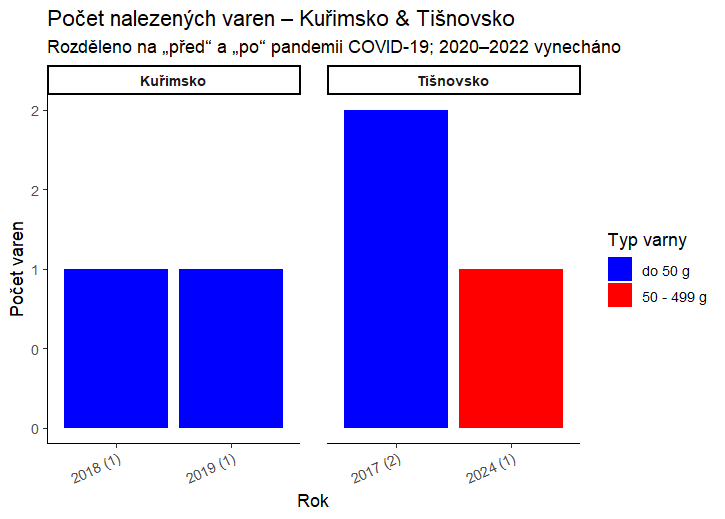 V období před pandemií COVID-19 (2017–2019) byly na Kuřimsku odhaleny 2 varny stejně tak i na Tišnovsku. V letech 2020–2022 nejsou v oficiálních statistikách zaznamenány žádné (chybí kompletní data za pandemické období). Po covidu se situace ustálila a roku 2024 byla nalezena pouze jedna středně velká varna na Tišnovsku v Lomničce. V roce 2025 nebyla nalezena ani jedna varna v obou regionech. Takový trend skutečně může naznačovat, že produkce v regionu v posledních letech značně klesla a již se dále nešíří motivace ani vědomosti potřebné k výrobě pervitinu poté, co původní komunity a jednotlivci byli přistiženi policií.